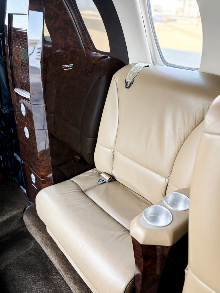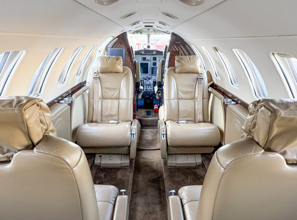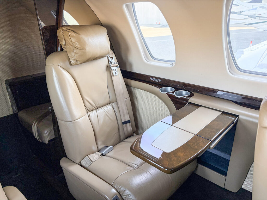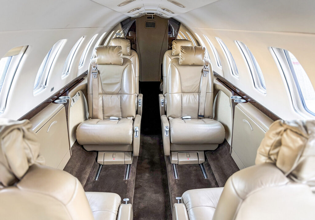 7-Place Beige Leather Seating in a Center Club Configuration with Two Aft Forward-Facing Seats and One RH Forward Side-Facing Seat, an Aft Belted Flushing Lavatory, and a Forward Slimline Refreshment Center.