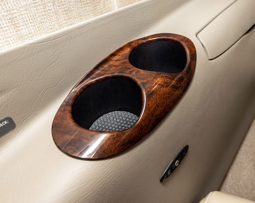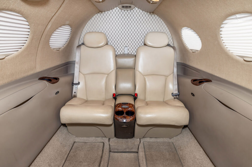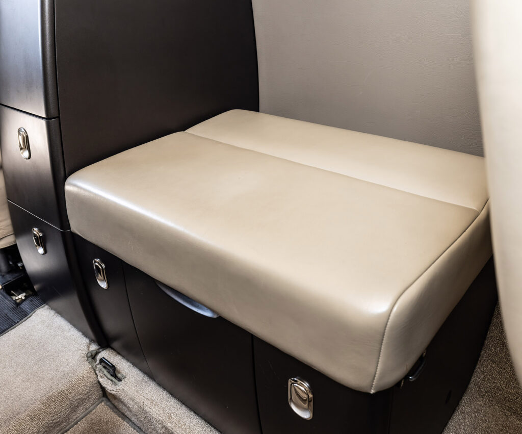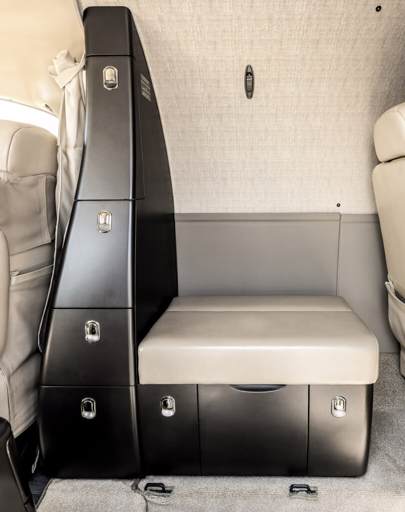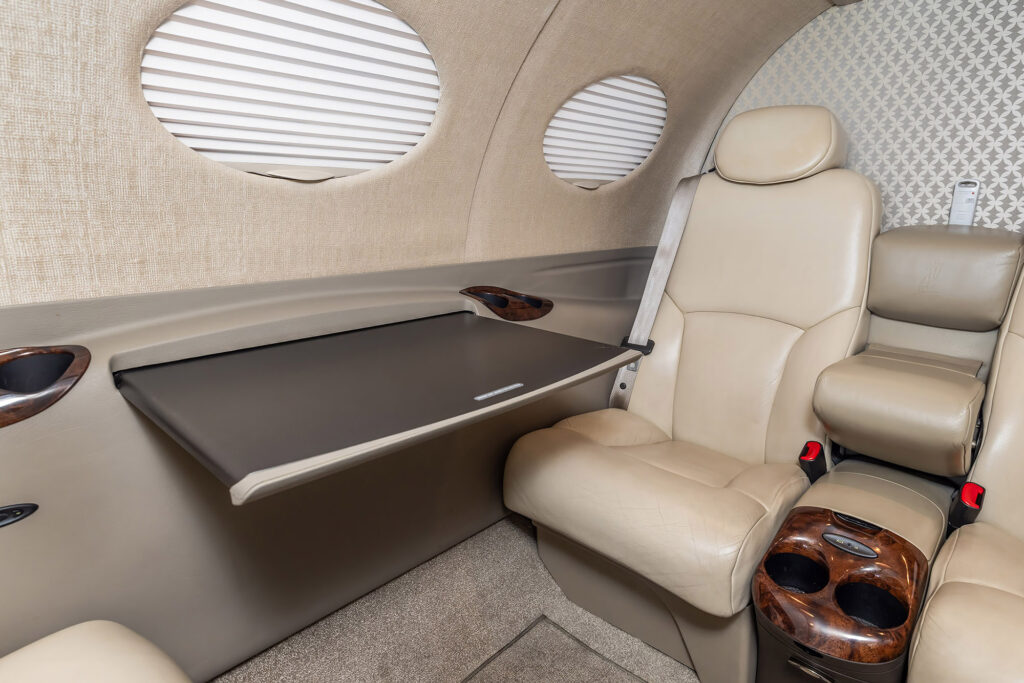 Smoky Quartz upgraded interior featuring seating for four passengers. Configuration includes a forward side-facing non-belted toilet, dual executive writing tables, an aft center console, and forward storage cabinets on both the left and right sides.